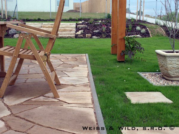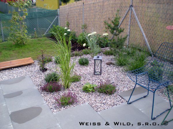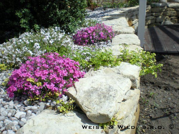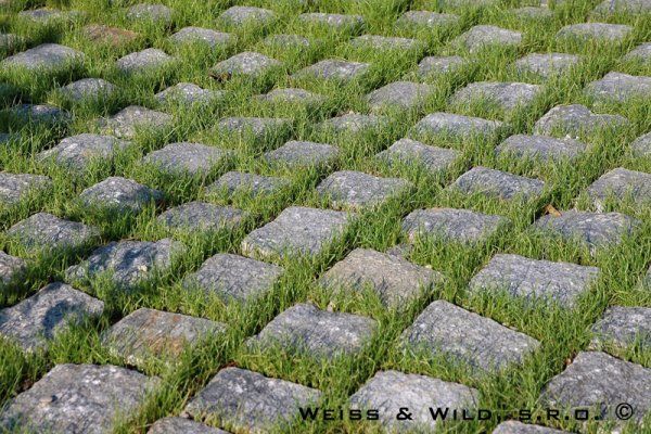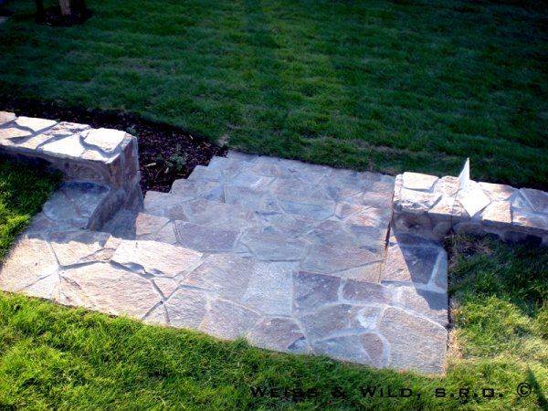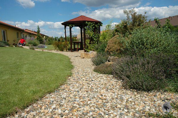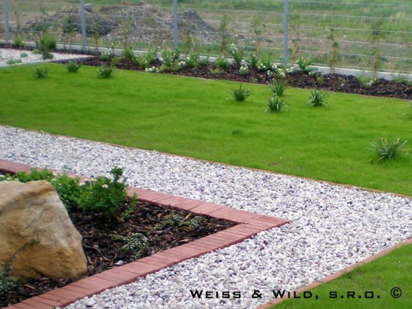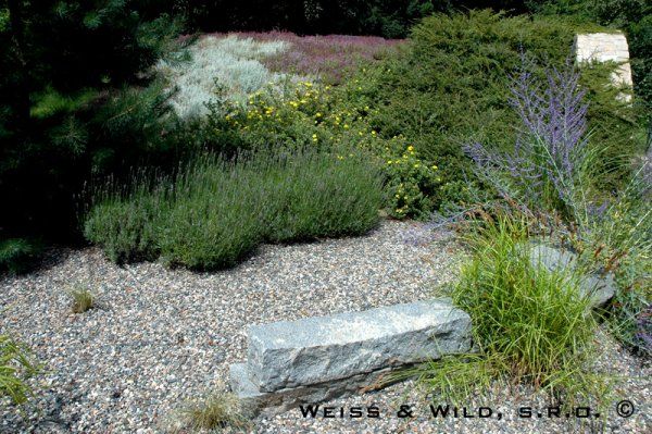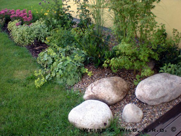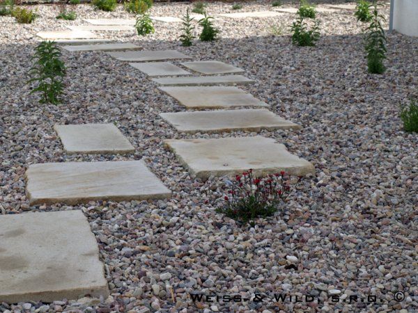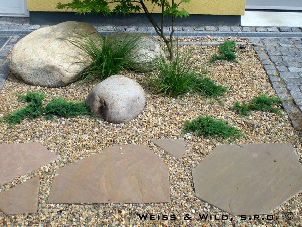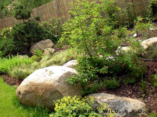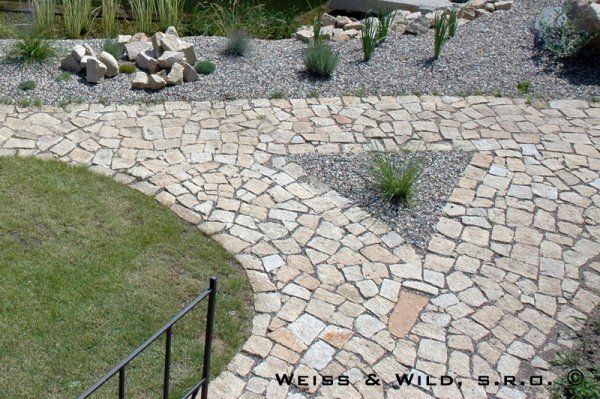 Kromě přírodního kamene používáme v zahradách i klasické kamenické výrobky jako jsou sekané žulové kostky různých velikostí, např. v podobě dělících lemů kolem jednotlivých záhonů. Kameny, které v našich realizacích používáme, jsou z více než devadesáti procent tuzemského původu. Z domácích lomů pocházejí především vápence, pískovce i žuly, stejně tak jako používaný říční štěrk (kačírek), říční valouny a lomové ostrohranné štěrky. Přestože se snažíme ctít princip výhradního využití domácích materiálů, v případě požadavku na výraznější specifické barevné efekty používáme i kameny a štěrky dovážené.